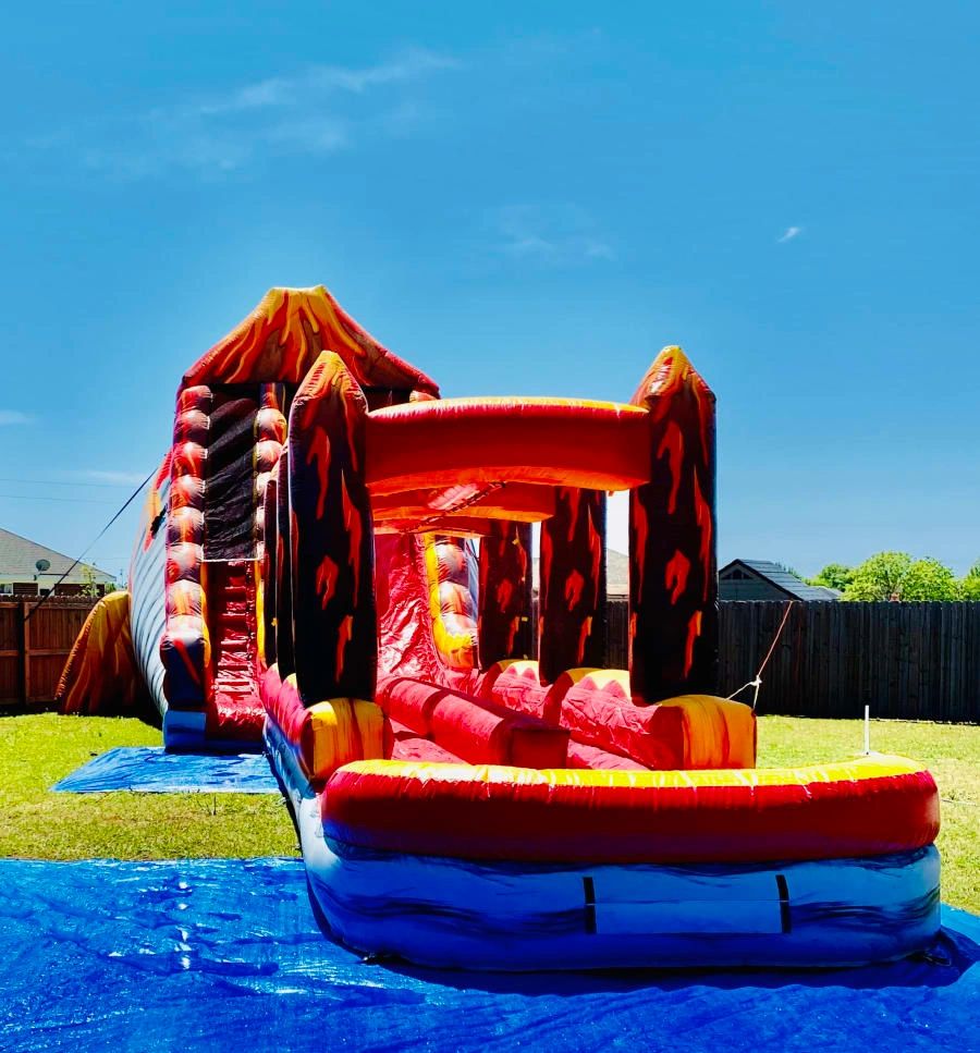 This 22ft show stopper offers dual lane racing that allows two people to race to the bottom featuring a 30ft long slip and slide landing in a large pool. Taxes are not included in the price and must be added. Price for one day ask about second day/weekend price. We deliver to most Baldwin County, AL Locations with free delivery within 20 mile radius of our Elberta , AL location.